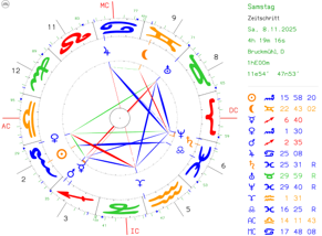 Mars tritt am 04.11.25 ins weltoffene Zeichen Schütze ein, bringt Optimismus in seine Taten, zeigt offensiv auf Dinge und Themen über dem Tellerrand – in Opposition zum Uranus ist auch ein starker Drang nach Wissensaustausch, die Dringlichkeit neuer Ideen und Offenheit für Neues greifbar. Die Vielzahl der stark ausgeprägten Aspekte läßt ebenso auf Handlungsbedarf schließen, um durch Diskussion und Handlung aus der Komfortzone heraus zu zufriedenstellenden Ergebnissen zu gelangen! Der Wechsel der Venus ins leidenschaftliche Zeichen Skorpion findet Mitternacht vom 6. auf 7.11.25 statt und deutet eine Art Suche an, Bedürfnis Balance herzustellen, Emotionen aufzuarbeiten, starke Spannungen aufzuarbeiten und die Ursachen zu betrachten. Geheimnisse möchten ans Licht! Uranus ist am 8.11.25 in seiner Rückläufigkeit nun wieder zurück im treuen und stabilen Stier angelangt, verweilt dort noch bis April nächsten Jahres, setzt nochmal seine kreativen Fähigkeiten für Ressourcen, Natur und stabile Rahmenbedingungen ein, um daraus ein gutes Sprungbrett für die spontane, lernfreudige Luftenergie zu erbauen! Der 30.11.25 bringt den Wechsel der Venus in den Schützen, aktiviert neue Zielsetzungen, bringt Bewegung und spannende Ideen, angefeuert auch durch die Opposition zum Uranus, der trotzdem auf Bodenhaftung pocht um Neues auch realisieren zu können.